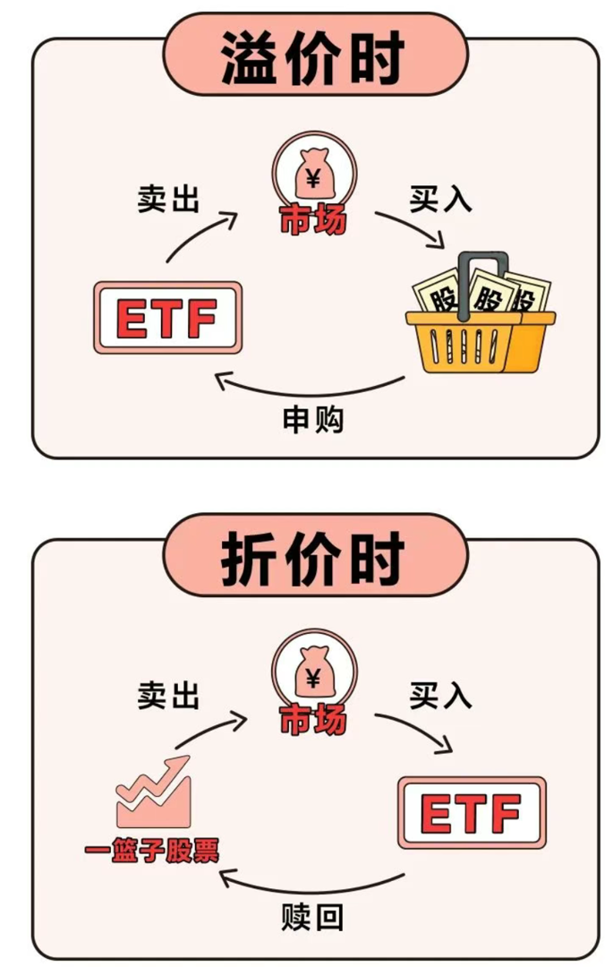 当ETF份额的二级市场交易价格和一级市场净值不一致时,即出现套利机会。流动性服务商或者其他投资者都可以通过申购ETF份额并卖出,或赎回ETF份额并卖出成份券的方式进行套利。